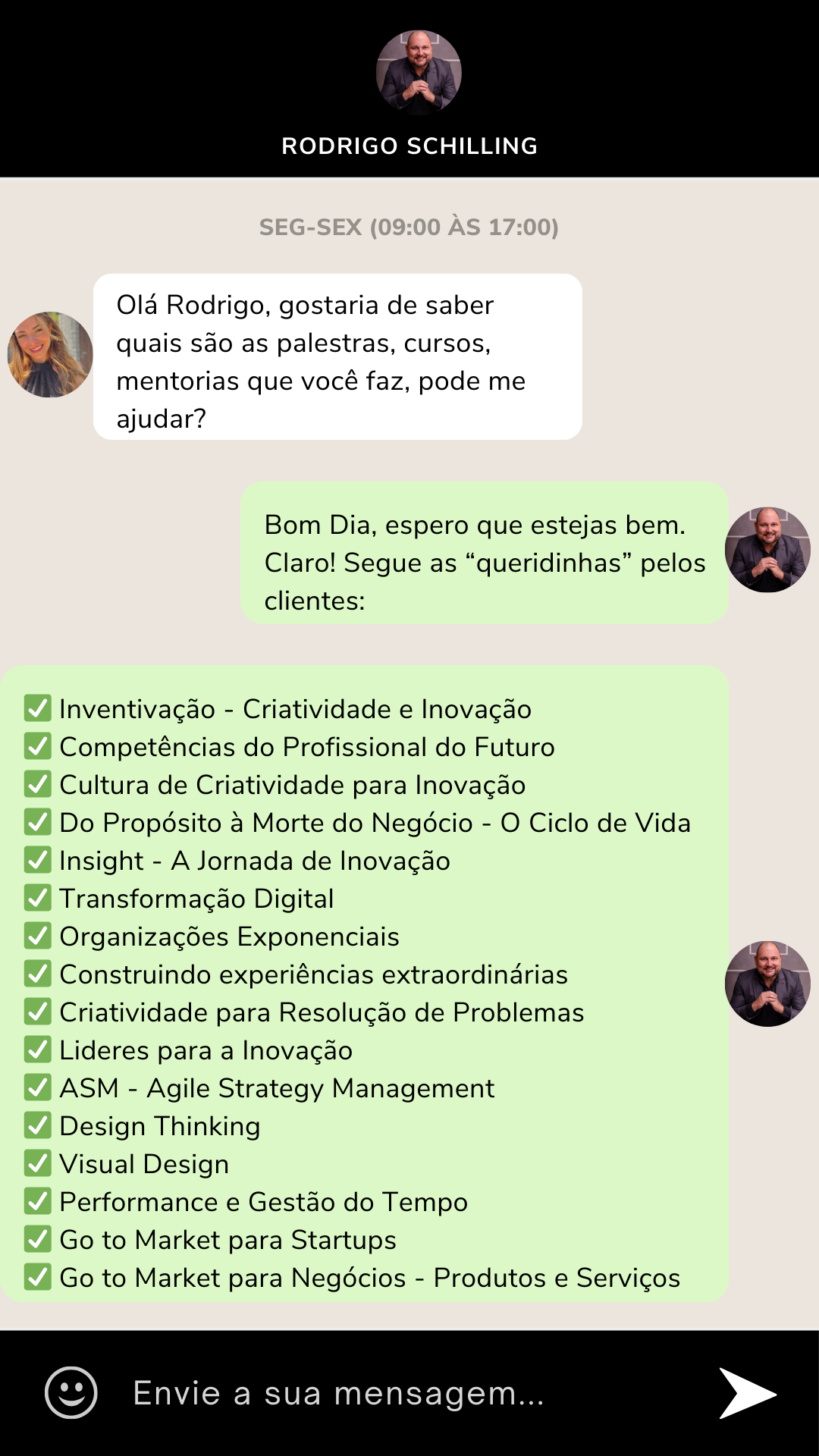 Hoje eu SIRVO CRIATIVIDADE, INOVAÇÃO e ESTRATÉGIA DE NEGÓCIOS, e acredito que eu possa colaborar intensamente durante a sua trajetória e a transformação do seu negócio.